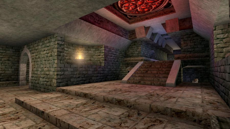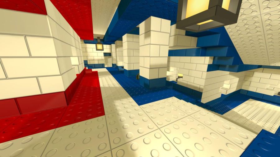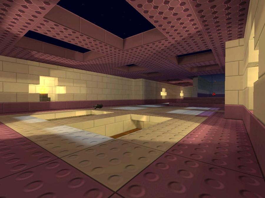 This map began as an expanded version of Curse][, one of the default DM maps for UT. There wasn't a floorplan, I went for expanding the map by adding some new paths and another floor on top of the existing one. I made some changes to the original layout to connect the new floor and due to the different physics in OA. In UT the players can perform a slide trick that allows them to slide upwards, something that doesn't exist in OA. I didn't put any thought in stairs vs jump pads. It was about available space to build a staircase. For this map I went for a contrast between warm, fire and night, cold, blue ambient light. With the whole map having lights of the same color I resorted to colored lego bricks to differentiate different zones of the map. The oppose of what I did with Goldeneye Grit Complex, where textures had the same color and the lights had different colors per zone. In the original UT map there was fire and it was dark. I created some lamps that purposely cast shadows. I also added torches in openings in walls with bricks to cast shadows. I wanted shadows everywhere to compensate for the lack of detailed geometry or architecture. I didn't invest much though in item placement. It was all about spreading them without caring much about their value. The only exception is a super health that requires jumping over a gap.