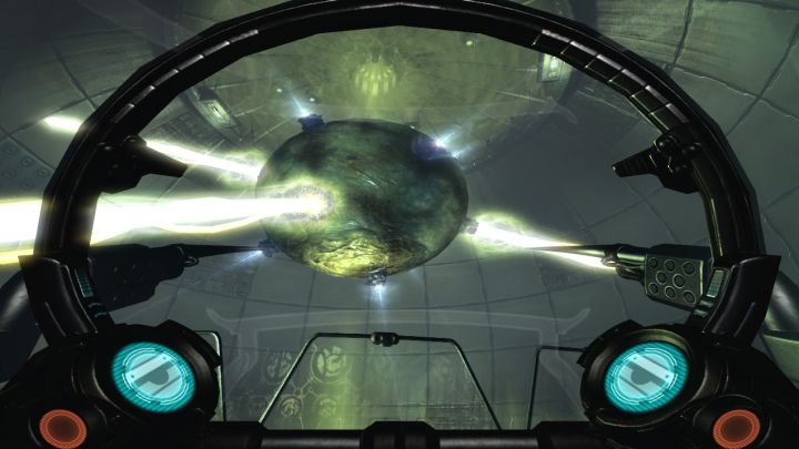 What the goal is? This shuttle has an electroshock weapon that requires the player to get close to the planetoid to use. The player has to get close to the red lights and use the electroshock weapon to activate it, which turns on an energy beam. The devices that are off, not having an energy beam being fired, have the same design as some security turrets that would fire at the player in other parts of the game. The developers were expecting the player to guess that they have to use the only weapon at hand on those devices on the planetoid. If the player's shuttle hits an energy beam it's temporarily disabled, which is a rather counter-intuitive behavior. It'd had been more logical to destroy the already on devices on the planetoid. After turning on all beams the planetoid explodes. The explosion itself being another illogical behavior.