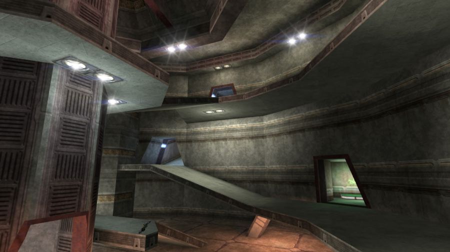 This deathmatch level has a huge pillar at the center of the map with an elevator inside. The pillar works as a landmark. All corridors and areas are placed around the central area. There are three different areas, each with a different texture on walls, floors and ceilings. The problem is that the blue lights at the entrance of each area and the ceiling lights are all equal and there isn't some unique architectural detail to make distinguishing each area easier. The teleports are all the same green color, which doesn't help to navigate the map. The ramps and platforms placed around the pillar are asymmetric, while at the same time the lights are all symmetric.