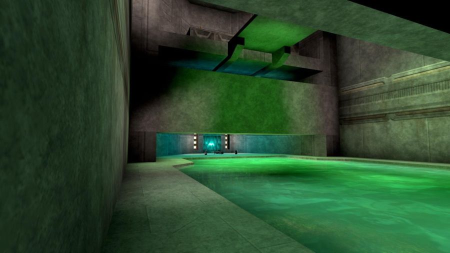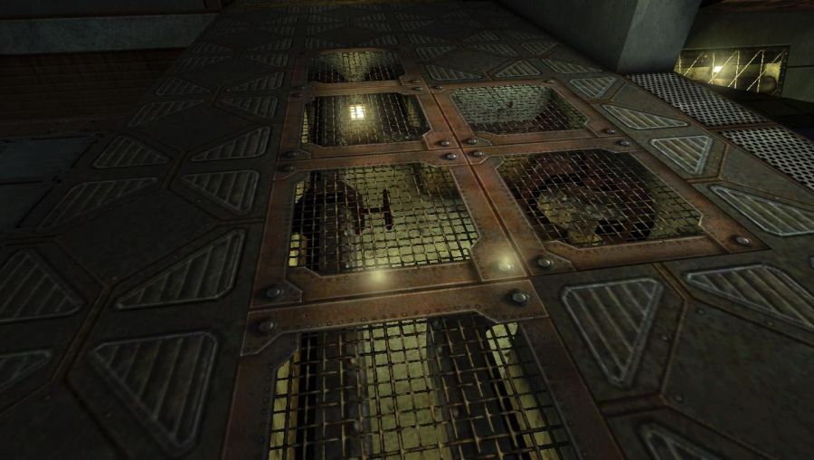I didn't have skills to make new textures from zero. The industrial theme was chosen based on the already existing textures. I think that the large pool of acid made me feel that some factory oriented theme was the way to go. That meant pipes, lots of pipes. In a very old version I had very thick pipes running in the corridor's walls. I abandoned it because the BSP was horrible with too many collision problems. It wasn't clean, having to aim at players with a flat wall behind them is cleaner. The pipes under the grates are purely eye candy.