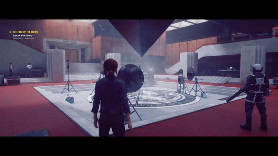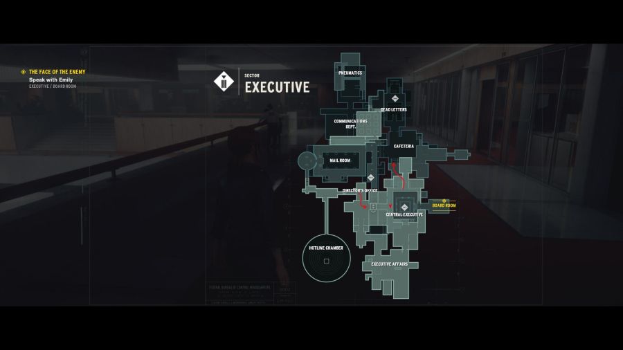 The first boss encounter in the game. See how the mission begins at the Central Executive. From there the player go to the Cafeteria. After the player finds the Hotline and the mission ends, the player is back to the Director's Office. The corridor back to the Central Executive is right next to the Director's Office. Every mission in this game follows this exact same pattern. In spite of following a loop design, I should mention that there are other factors in play that make the level design in this game pretty confusing.