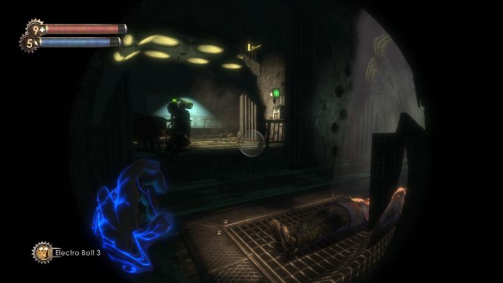 In the penultima level of the game the player is tasked with protecting a little girl from enemy attacks. A very common mission among many other games, to escort a NPC or to defend some structure from incoming attacks. In this level there are some corpses that the little girl is going to stop by to drain them. In these key points the designers made a conscious decision to place a security camera and a health station. The player can choose to hack or to destroy the camera. To hack, to leave the health station alone or to destroy it. It's all up to the player to decide because as the little girl stops by the corpse a swarm of enemies attacks her and having the security camera hacked can make the defense much easier. To destroy or to hack the health station is about allowing the enemies to use it or be killed by it when they try to heal.